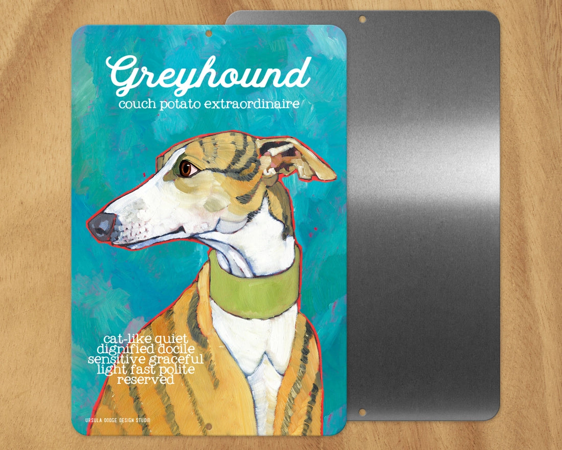 These Greyhound signs are glossy 8x12 metal signs reproduced from an original oil painting by Ursula Dodge. (Suitable to hang outdoors in protected area) Ursula's artwork has appeared on products for Starbuck's, Crate & Barrel, World Market, Cost Plus and Costco; her work has appeared in numerous publications such as Bon Appetit, Better Homes & Gardens and most recently Architectural Digest, as well as made appearances in film and on television shows. Products she has designed for licensors have sold in the following countries: U.S., Canada, Germany, Japan, UK and Spain. Ursula's original oil paintings are owned by collectors all over the world.